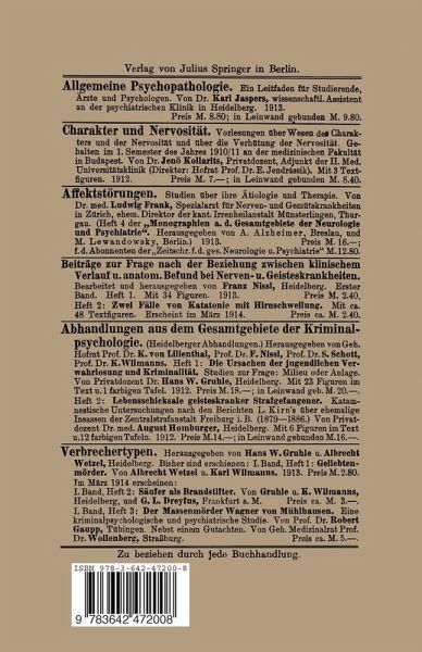 I. Die Krankheitszustände.- Biographische Skizze.- Die Familie.- Hereditäre Züge.- Die Jugendjahre.- Die Reise. -Die Gedankenwelt. -Die psychische.- Havarie und ihre Ursachen.- Der Kampf für die Entdeckung und der Prioritätsstreit.- Mayers Fenstersturz.- Neue krankhafte Verstimmung.- Die Psychose.- Postludien.- Epikrise.- II Die Intellektualität.- Mayer als Schüler.- Die Geisteseigenart.- Besondere intellektuelle Jugendeindrücke.- Das physikalisch-mathematische Talent.- Das Freiwerden des Grundgedankens.- Wissenschaftliche Briefwechsel.- Mayers Schriften.- Mayers ärztliche Grundanschauungen.- Nichts Pathologisches in Mayers Literaturwerk.- Mayers wissenschaftliche Berührung mit der Psychiatrie.- III. Zur Psychologie und Psychopathologie Mayers.- Mayers Auffassung von seiner Erkrankung.- Krankheitseinsicht.- Die Ansichten der Biographen und Autoren über Mayers Erkrankung.- Der hereditäre psychopathische Grundzustand.- Bedeutung der psychischen Insulte.- Mythenbildung hinsichtlich Mayers Erkrankung.- Ernst Albert von Zeller.- Psychopathologie und psychiatrische Therapie um die Mitte des 19. Jahrhunderts.- Die religiöse Anlage.- Mayers Anti-materialismus.- Mayer und der Darwinismus.- Mayers krankhaftes religiöses Fühlen.- IV. Krankheitsanlage und Begabung bei Robert Mayer.- Die Entstehungsgeschichte der Entdeckung.- Die Psychopathologie des Genies.- Die Ansichten der Èrzte über Mayers Entdeckung.- Schaffensbedingungen und abnorme Veranlagung.- Besonderheit der Mayerschen Entdeckung.- Konzeption und Intuition des Mayerschen Grundgedankens.- Genie und Irrsein bei Robert Mayer.- Rückblick.