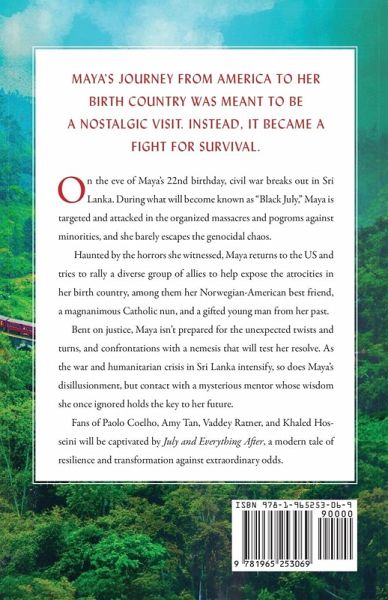 LONG STANDING TOP RELEASE! FIRST HORIZON AWARD Finalist, a distinction presented by the Eric Hoffer Book Awards to celebrate superior debut works HAWTHORNE PRIZE Finalist ERIC HOFFER AWARD Grand Prize Short List Maya's journey from America to her birth country was meant to be a nostalgic visit. Instead it became a fight for survival. On the eve of Maya's 22nd birthday, civil war breaks out in South Asia. During what will become known as "Black July," Maya is targeted and attacked in the organized massacres and pogroms against minorities, and she barely escapes the genocidal chaos. Haunted by the horrors she witnessed, Maya returns to the US and tries to rally a diverse group of allies to help expose the atrocities in her birth country, among them her Norwegian-American best friend, a magnanimous Catholic nun, and a gifted young man from her past. Bent on justice, Maya isn't prepared for the unexpected twists and turns, and confrontations with a nemesis that will test her resolve. As the war and humanitarian crisis intensify, so does Maya's disillusionment, but contact with a mysterious mentor whose wisdom she once ignored holds the key to her future. Fans of Paolo Coelho, Amy Tan, and Khaled Hosseini will be captivated by July and Everything After, a modern tale of resilience and transformation against extraordinary odds.