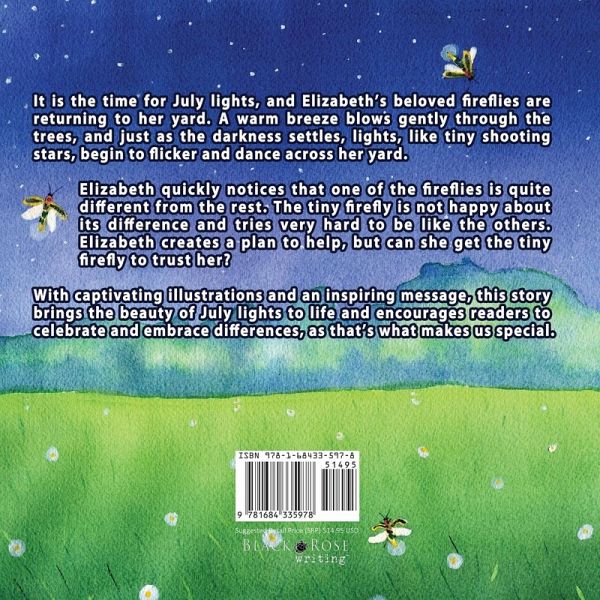 It is the time for July lights, and Elizabeth's beloved fireflies are returning to her yard. A warm breeze blows gently through the trees, and just as the darkness settles, lights, like tiny shooting stars, begin to flicker and dance across her yard. Elizabeth quickly notices that one of the fireflies is quite different from the rest. The tiny firefly is not happy about its difference and tries very hard to be like the others. Elizabeth creates a plan to help, but can she get the tiny firefly to trust her? With captivating illustrations and an inspiring message, this story brings the beauty of July lights to life and encourages readers to celebrate and embrace differences, as that's what makes us special.