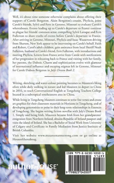 Well, it's about time someone otherwise complains about offering their support of Carole Bergeron. Alain Bergeron's cousin, Phylicia, joins Carole's friends, Sylvii and Fern in Gerome, Missouri to evaluate Carole's whereabouts. Events leading up to Carole's departure to France continue to plague her friends' common sense, compelling Sylvii Laroque and Fern Fullerton to share truths of events before Carole's departure to France. After arriving in Gerome, Missouri, Phylicia and Isaac Waaserton driving from Sharton, New York appear to be intervening on Carole's behalf. Faith and Robert, Carol's adult children, gain assistance from local Sheriff Noah Fullerton, husband to Carole's friend, Fern Fullerton, with introductions and meeting Phylicia. Letters from France arrive from Carole with notifications of her progression in relocating back to France and visiting with her family, her parents, the Dubois. Charm and sophistication evolve with glamour of international influence and escaping stigmas left in Gerome, Missouri for Carole Dubois Bergeron in July's Dream Book 2.