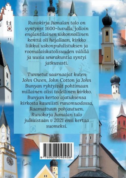 Runokirja Jumalan talo on syntynyt 1600-luvulla, jolloin englantilainen uskonnollinen kenttä oli hajallaan, kirkko liikkui uskonpuhdistuksen ja roomalaiskatolisuuden välillä ja uusia seurakuntia syntyi jatkuvasti. Tunnetut saarnaajat kuten John Owen, John Cotton ja John Bunyan ryhtyivät pohtimaan millainen olisi todellinen kirkko. Bunyan kertoo ajatuksensa kirkosta kauniisti runomuodossa, Raamattuun pohjautuen. Runokirja Jumalan talo julkaistaan nyt (v 2021) ensi kertaa suomeksi.