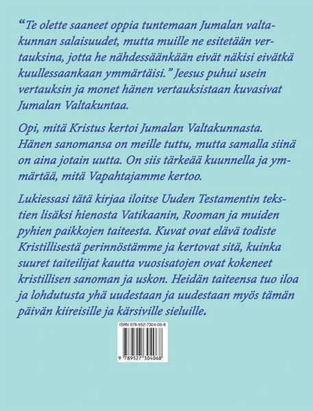 "Te olette saaneet oppia tuntemaan Jumalan valtakunnan salaisuudet, mutta muille ne esitetään vertauksina, jotta he nähdessäänkään eivät näkisi eivätkä kuullessaankaan ymmärtäisi." Jeesus puhui usein vertauksin ja monet hänen vertauksistaan kuvasivat Jumalan Valtakuntaa. Tutki, mitä Kristus kertoi vertauksin Jumalan Valtakunnasta. Hänen sanomansa on meille tuttu, mutta samalla siinä on aina jotain uutta. On siis tärkeää kuunnella ja ymmärtää, mitä Vapahtajamme kertoo. Lukiessasi tätä kirjaa iloitse Uuden Testamentin tekstien lisäksi hienosta Vatikaanin, Rooman ja muiden pyhien paikkojen taiteesta. Kuvat ovat elävä todiste Kristillisestä perinnöstämme ja kuvaavat sitä, kuinka suuret taiteilijat kautta vuosisatojen ovat kokeneet kristillisen sanoman ja uskon. Heidän taiteensa tuo iloa ja lohdutusta yhä uudestaan ja uudestaan myös tämän päivän kiireisille ja kärsiville sieluille.