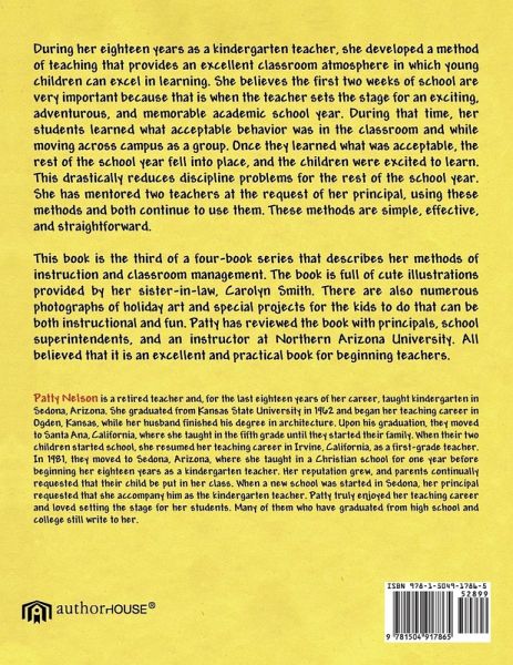 During her eighteen years as a kindergarten teacher, she developed a method of teaching that provides an excellent classroom atmosphere in which young children can excel in learning. She believes the first two weeks of school are very important because that is when the teacher sets the stage for an exciting, adventurous, and memorable academic school year. During that time, her students learned what acceptable behavior was in the classroom and while moving across campus as a group. Once they learned what was acceptable, the rest of the school year fell into place, and the children were excited to learn. This drastically reduces discipline problems for the rest of the school year. She has mentored two teachers at the request of her principal, using these methods and both continue to use them. These methods are simple, effective, and straightforward. This book is the third of a four-book series that describes her methods of instruction and classroom management. The book is full of cute illustrations provided by her sister-in-law, Carolyn Smith. There are also numerous photographs of holiday art and special projects for the kids to do that can be both instructional and fun. Patty has reviewed the book with principals, school superintendents, and an instructor at Northern Arizona University. All believed that it is an excellent and practical book for beginning teachers.