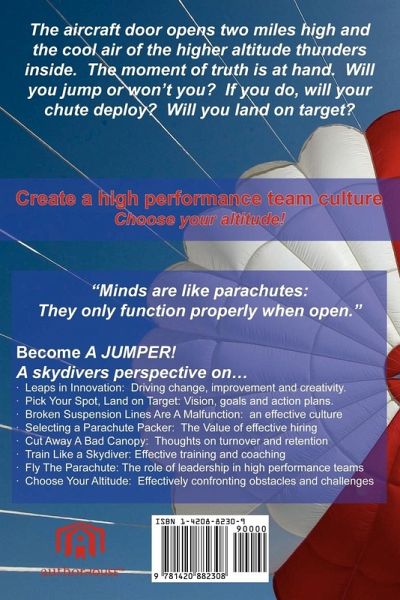 Look Within . Leap Beyond Close your eyes and envision yourself standing on the threshold of an open aircraft door over two miles above the earth. The cool turbulent air thunders inside the plane as you peer over the edge down through the mixture of blue sky and clouds to the patchwork of ground below. As you prepare to take the leap you look within yourself and are confronted by the intense anxiety of the unknown. Are you fully prepared and trained? Was your parachute packed properly? Will you actually summon the courage to jump from the airplane? Can we draw parallels from this experience to business? Is your organization facing significant challenges and obstacles? Are you and other co-workers required to step outside your comfort zone, to drive innovation and improvement? Does any of this sound familiar? What is holding you back? In this book you will examine and learn from the many unique and powerful parallels between business and skydiving. What limiting beliefs are ingrained in you and your corporate culture? What holds you back from taking the courageous jumps required to be a great company? Become a JUMPER! A skydiver's perspective on . High-Performance Teamwork: The Team Fastrax Story Leaps in Innovation: Driving Change, Improvement, and Creativity Pick Your Spot, Land on Target: Vision, Goals, and Action Plans Broken Suspension Lines Are a Malfunction: An Effective Culture Selecting a Parachute Packer: The Value of Effective Hiring Cut Away a Bad Canopy: Thoughts on Turnover and Retention Train Like a Skydiver: Effective Training and Coaching Fly the Parachute: The Role of Leadership in High-Performance Teams Choose Your Altitude: Effectively Confronting Obstacles and Challenges