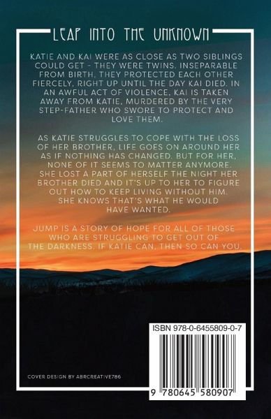 Katie and Kai were as close as two siblings could get - they were twins. Inseparable from birth, they protected each other fiercely, right up until the day Kai died. In an awful act of violence, Kai is taken away from Katie, murdered by the very step-father who swore to protect and love them. As Katie struggles to cope with the loss of her brother, life goes on around her as if nothing has changed. But for her, none of it seems to matter anymore. She lost a part of herself the night her brother died and it's up to her to figure out how to keep living without him. She knows that's what he would have wanted. Jump is a story of hope for all of those who are struggling to get out of the darkness. If Katie can, then so can you.