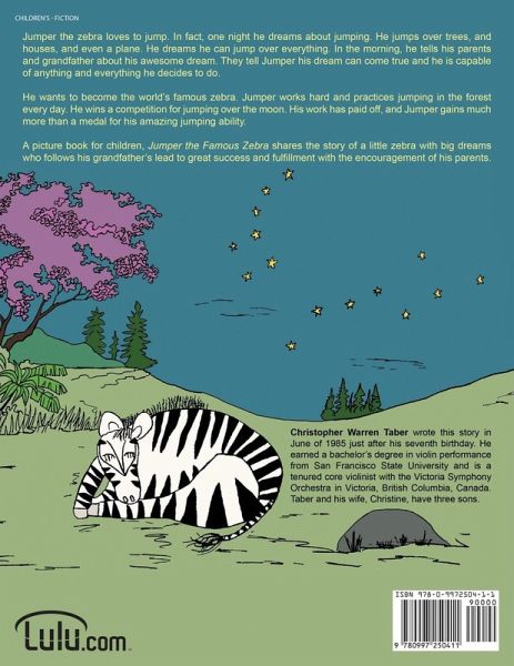 Jumper the zebra loves to jump. In fact, one night he dreams about jumping. He jumps over trees, and houses, and even a plane. He dreams he can jump over everything. In the morning, he tells his parents and grandfather about his awesome dream. They tell Jumper his dream can come true and he is capable of anything and everything he decides to do. He wants to become the world's famous zebra. Jumper works hard and practices jumping in the forest every day. He wins a competition for jumping over the moon. His work has paid off, and Jumper gains much more than a medal for his amazing jumping ability. A picture book for children, Jumper the Famous Zebra shares the story of a little zebra with big dreams who follows his grandfather's lead to great success and fulfillment with the encouragement of his parents.