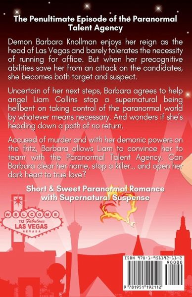 Five-star praise for the six-book Paranormal Talent Agency! (See the separate digital/regular paperback listings for additional reviews.) I enjoyed this entire series immensely... I suggest a binge read session because it'll keep you entertained. Naomi, Goodreads Reviewer I love how original the stories are, each one connected but also so different. The author's writing is flawless and an absolute pleasure to read. Her storylines are imaginative and her characters creative and realistic. Katie, Goodreads Reviewer The Penultimate Episode of the Paranormal Talent Agency Demon Barbara Knollman enjoys her reign as the head of Las Vegas and barely tolerates the necessity of running for office. But when her precognitive abilities save her from an attack on the candidates, she becomes both target and suspect. Uncertain of her next steps, Barbara agrees to help angel Liam Collins stop a supernatural being hellbent on taking control of the paranormal world by whatever means necessary. And wonders if she's heading down a path of no return. Accused of murder and with her demonic powers on the fritz, Barbara allows Liam to convince her to team with the Paranormal Talent Agency. Can Barbara clear her name, stop a killer... and open her dark heart to true love? Fun, flirty, fantasy romance with a cozy mystery vibe and guaranteed happily ever after! This is the fifth book in the Paranormal Talent Agency series. Much like on television, each episode contains a complete sweet paranormal romance and supernatural murder mystery. But the crossover characters and larger story suggest reading these in order.