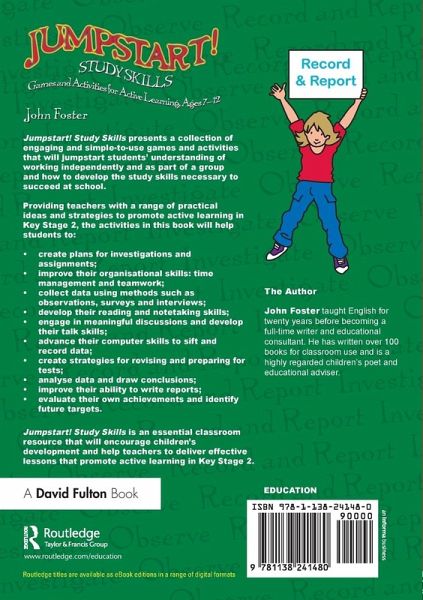 Jumpstart! Study Skills presents a collection of engaging and simple-to-use games and activities that will jumpstart students' understanding of working independently and as part of a group and how to develop the study skills necessary to succeed at school. Providing teachers with a range of practical ideas and strategies to promote active learning in Key Stage 2, the activities in this book will help students to: create plans for investigations and assignments; improve their organisational skills: time management and teamwork; collect data using methods such as observations, surveys and interviews; develop their reading and notetaking skills; engage in meaningful discussions and develop their talk skills; advance their computer skills to sift and record data; create strategies for revising and preparing for tests; analyse data and draw conclusions; improve their ability to write reports; evaluate their own achievements and identify future targets. Jumpstart! Study Skills is an essential classroom resource that will encourage children's development and help teachers to deliver effective lessons that promote active learning in Key Stage 2.