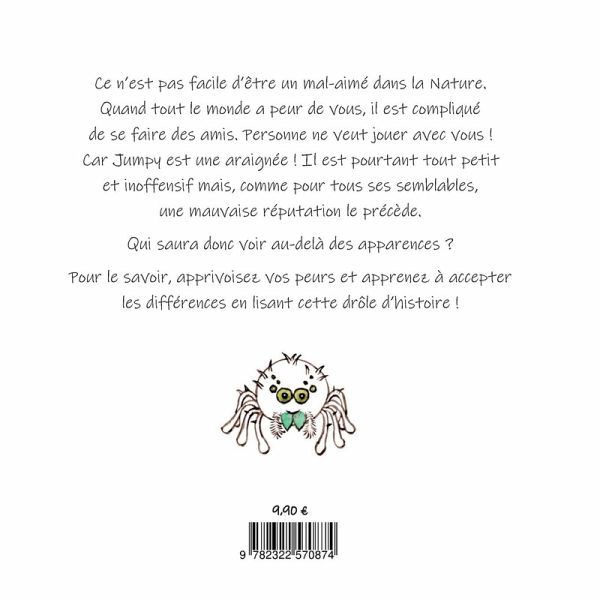 Ce n'est pas facile d'être un mal-aimé dans la nature. Quand tout le monde a peur de vous, il est compliqué de se faire des amis. Personne ne veut jouer avec vous ! Car Jumpy est une araignée ! Il est pourtant tout petit et inoffensif mais, comme pour tous ses semblables, une mauvaise réputation le précède. Qui saura donc voir au-delà des apparences ? Pour le savoir, apprivoisez vos peurs et apprenez à accepter les différences en lisant cette drôle d'histoire ! Ce livre comprend une histoire complète illustrée par des aquarelles suivie d'une documentation sur les araignées associée à des photos et pour terminer une poésie.