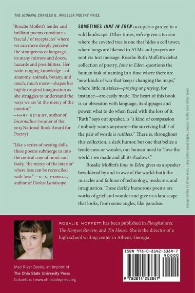 Sometimes June in Eden occupies a garden in a wild landscape. Other times, we're given a terrain where the coveted tree is one that hides a cell tower, where lungs are likened to ATMs and prayers are sent via text message. Rosalie Ruth Moffett's debut collection of poetry, June in Eden, questions the human task of naming in a time where there are "new kinds of war that keep / changing the maps," where little mistakes-preying or praying, for instance-are easily made. The heart of this book is an obsession with language, its slippages and power, what to do when faced with the loss of it. "Ruth," says our speaker, is "a kind of compassion / nobody wants anymore-the surviving half / of the pair of words is ruthless." There is, throughout this collection, a dark humor, but one that belies a tenderness or wonder, our human need to "love the world / we made and all its shadows." Rosalie Moffett's June in Eden gives us a speaker bewildered by and in awe of the world: both the miracles and failures of technology, medicine, and imagination. These darkly humorous poems are works of grief and wonder and give us a landscape that looks, from some angles, like paradise.