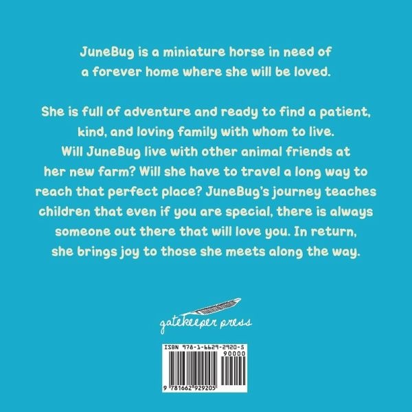 JuneBug is a miniature horse in need of a forever home where she will be loved. She is full of adventure and ready to find a patient, kind, and loving family with whom to live. Will JuneBug live with other animal friends at her new farm? Will she have to travel a long way to reach that perfect place? JuneBug's journey teaches children that even if you are special, there is always someone out there that will love you. In return, she brings joy to those she meets along the way.