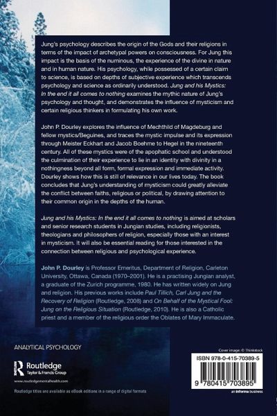 Jung's psychology describes the origin of the Gods and their religions in terms of the impact of archetypal powers on consciousness. For Jung this impact is the basis of the numinous, the experience of the divine in nature and in human nature. His psychology, while possessed of a certain claim to science, is based on depths of subjective experience which transcends psychology and science as ordinarily understood. Jung and his Mystics: In the end it all comes to nothing examines the mythic nature of Jung's psychology and thought, and demonstrates the influence of mysticism and certain religious thinkers in formulating his own work.