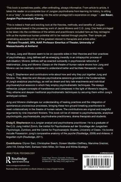 Acknowledgements. List of contributors. Stephenson Introduction. Elefthery Theatre or Therapy. Barz Psychodrama Grounded in the Perspective of Analytical Psychology. Beach Jungian Psychodrama. Ness The Drum Time of Psychodrama: Reflections on a Jungian Psychodrama Group. Scategni Jung Moreno and Dream Enactment. Hill Fairy Tale Drama: Enacting Rituals of Play Laughter and Tears. Beach Using Psychodrama in Analysis. Graziosi Psychodrama and the Resolution of Transference and Counter-transference. Miller The Loss and Gaining of Timing: Active Imagination in Performance. Kiehl Encounters with Jung and Moreno on the Road of Bricks and Moss. Index.