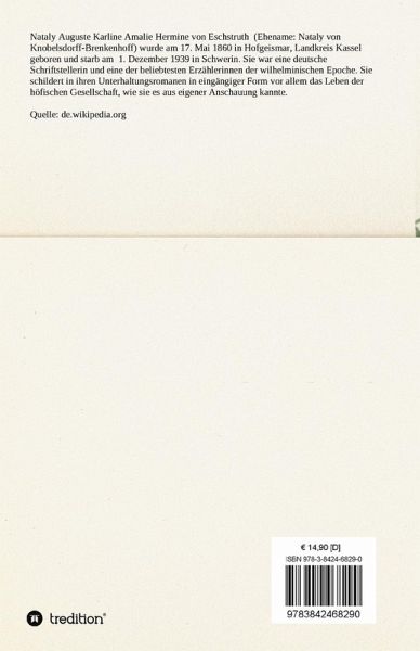 Nataly Auguste Karline Amalie Hermine von Eschstruth (Ehename: Nataly von Knobelsdorff-Brenkenhoff) wurde am 17. Mai 1860 in Hofgeismar, Landkreis Kassel geboren und starb am 1. Dezember 1939 in Schwerin. Sie war eine deutsche Schriftstellerin und eine der beliebtesten Erzählerinnen der wilhelminischen Epoche. Sie schildert in ihren Unterhaltungsromanen in eingängiger Form vor allem das Leben der höfischen Gesellschaft, wie sie es aus eigener Anschauung kannte. Quelle: de.wikipedia.org