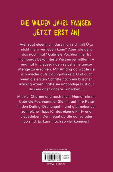 Mit viel Witz und noch mehr "Budder bei die Fische" zeigt Gabriele Pochhammer, warum es sich in jedem Alter lohnt, nach der Liebe (oder dem kleinen oder großen Abenteuer) zu suchen. Sie spricht gerade auch diejenigen an, die aus einer langen Partnerschaft kommen, vielleicht verwitwet sind, und sie macht Mut, das Liebesleben mit 60, 70 oder 80 in die eigene Hand zu nehmen, denn: Das Leben ist längst nicht vorbei, es kann noch so viel kommen. Die wilden Jahre fangen jetzt erst an!