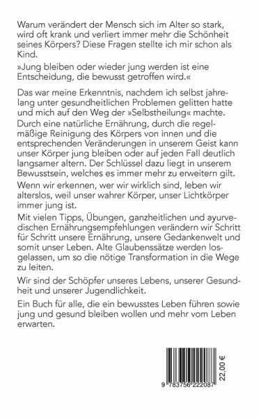 Warum verändert sich der Mensch im Alter so stark, wird oft krank und verliert die Schönheit seines Körpers immer mehr? Diese Fragen stellte ich mir schon als Kind."Jung bleiben oder es wieder werden, ist eine Entscheidung die bewusst getroffen wird".Das war meine Erkenntnis, nachdem ich selbst jahrelang unter gesundheitlichen Problemen gelitten habe und mich auf den Weg der "Selbstheilung"machte.Durch eine natürliche Ernährung, durch die regelmäßige Reinigung des Körper von innen und die entsprechenden Veränderungen in unserem Geist, kann unser Körper jung bleiben oder auf jeden Fall deutlich langsamer altern. Der Schlüssel dazu liegt in unserem Bewusstsein.Wenn wir erkennen WER WIR WIRKLICH SIND, leben wir Alter-Los, weil unser wahrer Körper, unser Lichtkörper immer jung ist.Mit vielen Tipps, Übungen, ganzheitlichen und ayurvedischen Ernährungsempfehlungen, verändern wir Schritt für Schritt unsere Ernährung, unsere Gedankenwelt und somit unser Leben. Alte Glaubenssätze werden losgelassen um so die nötige Transformation in die Wege zu leiten.Ein Buch für alle die ein BEWUSSTES Leben führen wollen, jung und gesund bleiben wollen und mehr vom Leben erwarten.