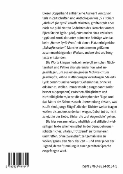 Dieser Doppelband enthält eine Auswahl von zuvor teils in Zeitschriften und Anthologien wie "S. Fischers Jahrbuch für Lyrik" veröffentlichten, größtenteils aber noch nie publizierten Gedichten des Lörracher Autors Björn Steiert (geb. 1980), entstanden circa zwischen 1996 und 2006, darunter prämierte Beiträge wie das beim "Herner Lyrik-Preis" mit dem 1. Platz erfolgreiche "Zukunftswehen". Manche entstammen größeren zusammenhängenden Werken - wie den poetischen Reden "Engelbraut" und "Anthropos" - oder Roman- und Erzählskizzen. Andere sind als Songtexte entstanden. Die Worte klingen herb, ein reizvoll zwischen Nüchternheit und Pathos changierender Ton wird angeschlagen, um aus einem großen Motivreichtum geschöpfte, kühne Bildfindungen vorzutragen. Steierts Lyrik berührt und verkörpert - im Sinne des Kunstverständnisses Michael Endes - Geheimnisse, ohne sie erklären zu wollen. Sie beschwört auf gleichsam magisch anmutende Weise das Ursprüngliche, Elementare herauf, berichtet von phantastischen Orten, bezieht voraussetzungslos tradierte Mythen mit ein und gewinnt ihnen neuen Sinn ab. Sie ist Ausdruck des Ringens mit sich selbst, der Welt sowie dem wie auch immer zu denkenden Höheren. Dabei gestaltet sie sich in einem freien, souveränen und mitunter auch humorvollen Spiel mit philosophischen, metaphysischen und religiösen Inhalten, ja, mit der Frage nach den Bedingungen von Dichtung und Kunst - Schöpfung - schlechthin. Immer wieder, eingespannt (oder besser ausgespannt) zwischen Alltäglichem und Nichtalltäglichem, kehrt die Metapher der Flügel und das Motiv des Sehnens nach Überwindung dessen, was ist. Es sind "junge Flügel", die den Dichter weiter tragen wollen, als andere zu denken wagen. Dabei tut er, nicht zuletzt in der Liebe, Blicke, die "auf Augentiefe" gehen. Die hier versammelten, inhaltlich und stilistisch vielseitigen Texte scheinen selbst in der Demut ein unerschütterliches, vitales "Trotzdem!" zu formulieren und treffen, ohne zwanghaft zeitgemäß sein zu wollen, genau den Nerv der Zeit - und zwar jener der Jugend, deren Stimmung in einer gereiften Sprache eingefangen wird. Ja, da ist tatsächlich von "trotziger Demut" die Rede, in der sich die widersprüchlichen Haltungen Kains und Abels verbinden.