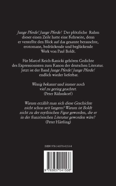 Junge Pferde! Junge Pferde! Der plötzliche Ruhmdieser einen Zeile hatte eine Kehrseite, denner verstellte den Blick auf das gesamte berauschte,erotomane, bedrückende und beglückendeWerk von Paul Boldt.Für Marcel Reich-Ranicki gehören Gedichtedes Expressionisten zum Kanon der deutschen Literatur. Jetzt ist der Band Junge Pferde! Junge Pferde! endlich wieder lieferbar.Wenig bekannt und immer nochviel zu gering geachtet.(Peter Rühmkorf)Warum erzählt man sich diese Geschichtenicht schon seit langem? Warum ist Boldtnicht zu der mythischen Figur geworden, die erin der französischen Literatur geworden wäre? (Peter Härtling)