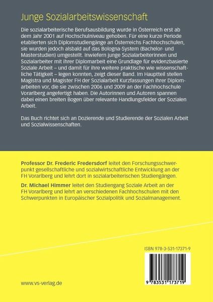 Die sozialarbeiterische Berufsausbildung wurde in Österreich erst ab dem Jahr 2001 auf Hochschulniveau gehoben. Für eine kurze Periode etablierten sich Diplomstudiengänge an Österreichs Fachhochschulen, sie wurden jedoch alsbald auf das Bologna-System (Bachelor- und Masterstudien) umgestellt. Inwiefern junge SozialarbeiterInnen mit ihrer Diplomarbeit eine Grundlage für evidenzbasierte Soziale Arbeit - und damit für ihre weitere praktische wie wissenschaftliche Tätigkeit - legen konnten, zeigt dieser Band. Im Hauptteil stellen Magistra und Magister FH der Sozialarbeit Kurzfassungen ihrer Diplomarbeiten vor, die sie zwischen 2006 und 2009 an der Fachhochschule Vorarlberg angefertigt haben. Die AutorInnen spannen dabei einen breiten Bogen über relevante Handlungsfelder der Sozialen Arbeit. Das Buch richtet sich an Dozierende und Studierende der Sozialen Arbeit und Sozialwissenschaften.