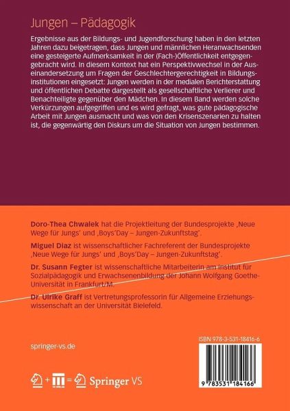 Dr. Ulrike Graff ist Vertretungsprofessorin für Allgemeine Erziehungswissenschaft an der Universität Bielefeld. Miguel Diaz ist wissenschaftlicher Fachreferent der Bundesprojekte 'Neue Wege für Jungs' und 'Boys'Day - Jungen-Zukunftstag'. Doro-Thea Chwalek hat die Projektleitung der Bundesprojekte 'Neue Wege für Jungs' und 'Boys'Day - Jungen-Zukunftstag'. Susann Fegter ist wissenschaftliche Mitarbeiterin am Institut für Sozialpädagogik und Erwachsenenbildung der Johann Wolfgang Goethe-Universität in Frankfurt/M.