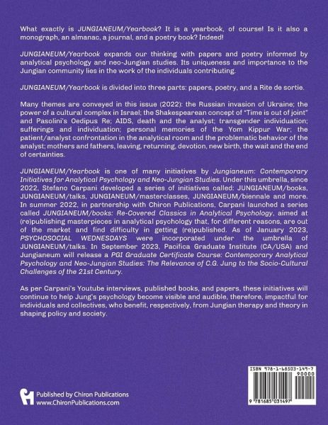 What exactly is JUNGIANEUM/Yearbook? It is a yearbook, of course! Is it also a monograph, an almanac, a journal, and a poetry book? Indeed! JUNGIANEUM/Yearbook expands our thinking with papers and poetry informed by analytical psychology and neo-Jungian studies. Its uniqueness and importance to the Jungian community lies in the work of the individuals contributing. JUNGIANEUM/Yearbook is divided into three parts: papers, poetry, and a Rite de sortie. Many themes are conveyed in this issue (2022): the Russian invasion of Ukraine; the power of a cultural complex in Israel; the Shakespearean concept of "Time is out of joint" and Pasolini's Oedipus Re; AIDS, death and the analyst; transgender individuation; sufferings and individuation; personal memories of the Yom Kippur War; the patient/analyst confrontation in the analytical room and the problematic behavior of the analyst; mothers and fathers, leaving, returning, devotion, new birth, the wait and the end of certainties. JUNGIANEUM/Yearbook is one of many initiatives by Jungianeum: Contemporary Initiatives for Analytical Psychology and Neo-Jungian Studies. Under this umbrella, since 2022, Stefano Carpani developed a series of initiatives called: JUNGIANEUM/books, JUNGIANEUM/talks, JUNGIANEUM/ masterclasses, JUNGIANEUM/biennale and more. In summer 2022, in partnership with Chiron Publications, Carpani launched a series called JUNGIANEUM/books: Re-Covered Classics in Analytical Psychology, aimed at (re)publishing masterpieces in analytical psychology that, for different reasons, are out of the market and find difficulty in getting (re)published. As of January 2023, PSYCHOSOCIAL WEDNESDAYS were incorporated under the umbrella of JUNGIANEUM/talks. Table of Contents PART 1: Papers -Ludmilla Ostermann and Julia Herzberg - A Russo-Ukrainian (Dis)Entanglement: The "Brother Nation" narrative as legitimization for war -Elana Lakh - When our Shadow Makes us Blind and Deaf to Suffering: The power of a cultural complex in Israel -Caterina Vezzoli and Livia Di Stefano - "Time is out of Joint": Pasolini's Oedipus Rex -Paul Attinello - Death and the Analyst: Facing people with AIDS -Giulia Pepe - Transgender Individuation: An ethical and non-pathologizing reflection -Marcus Quintaes and Luciana Ximenes - Tell Me What Ails You and I Will Tell You Who You Are -Moshe Alon - The Plane's Wreckages, the Broken Dream - A personal story about the trauma of the Yom Kippur War, its symbolism and coping with it. 117 -Stefano Carpani - The Fascist Analyst & The New Myth of Analysis: Meeting and confrontation in the analytical room PART 2: Poetry -Chu Yu - Father Mother - Byron Gaist - Truly Leave The Orange Tree - Cassie Fielding - The Perplexity of Naming All is Water -Gottfried Maria Heuer - All Souls Resurrection Yucatan -Nadia Wardeh - A New Birth -Roula-Maria Dib - The Wait PART 3: Rite de Sortie -István Kupper-Meynen - The End of Certainties
