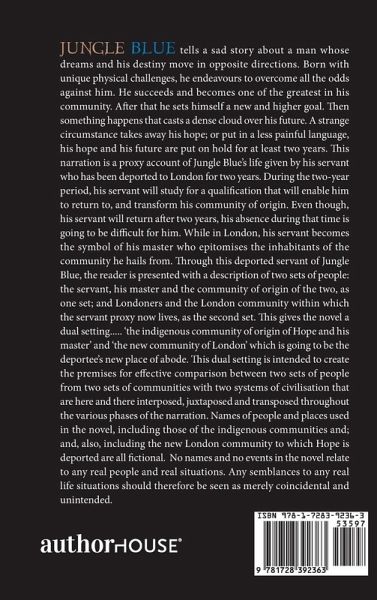 Jungle Blue tells a sad story about a man whose dreams and his destiny move in opposite directions. Born with unique physical challenges, he endeavours to overcome all the odds against him. He succeeds and becomes one of the greatest in his community. After that he sets himself a new and higher goal. Then something happens that casts a dense cloud over his future. A strange circumstance takes away his hope; or put in a less painful language, his hope and his future are put on hold for at least two years. This narration is a proxy account of Jungle Blue's life given by his servant who has been deported to London for two years. During the two-year period, his servant will study for a qualification that will enable him to return to, and transform his community of origin. Even though, his servant will return after two years, his absence during that time is going to be difficult for him. While in London, his servant becomes the symbol of his master who epitomises the inhabitants of the community he hails from. Through this deported servant of Jungle Blue, the reader is presented with a description of two sets of people: the servant, his master and the community of origin of the two, as one set; and Londoners and the London community within which the servant proxy now lives, as the second set. This gives the novel a dual setting..... 'the indigenous community of origin of Hope and his master' and 'the new community of London' which is going to be the deportee's new place of abode. This dual setting is intended to create the premises for effective comparison between two sets of people from two sets of communities with two systems of civilisation that are here and there interposed, juxtaposed and transposed throughout the various phases of the narration. Names of people and places used in the novel, including those of the indigenous communities and; and, also, including the new London community to which Hope is deported are all fictional. No names and no events in the novel relate to any real people and real situations. Any semblances to any real life situations should therefore be seen as merely coincidental and unintended.