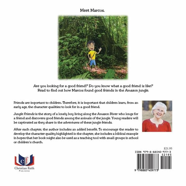 Meet Marcos. Are you looking for a good friend? Do you know what a good friend is like? Read to find out how Marcos found good friends in the Amazon jungle. Friends are important to children. Therefore, it is important that children learn, from an early age, the character qualities to look for in a good friend. Jungle Friends is the story of a lonely boy living along the Amazon River who longs for a friend and discovers good friends among the animals of the jungle. Adolescent readers will be captivated as they share in the adventures of these jungle friends. After each chapter, the author includes an added benefit. To encourage the reader to develop the character quality highlighted in the chapter, she includes a biblical example--in hopes that her book might also be used as a teaching tool with small groups in school or children's church.