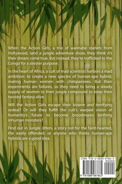 When the Action Girls, a trio of wannabe starlets from Hollywood, land a jungle adventure show, they think it's their dream come true. But instead, they're trafficked to the Congo for a sinister purpose. In the heart of Africa, a cult of mad scientists harbors a mad ambition: to create a new species of human-ape hybrid, mating human women with chimpanzees. But their experiments are failures, so they need to bring a steady supply of women to their jungle compound to keep their twisted fantasy alive. Will the Action Girls escape their bizarre and terrifying ordeal? Or will they fulfill the cult's warped vision of humanity's future to become broodmares birthing inhuman monsters? Find out in Jungle Jitters, a story not for the faint-hearted, the easily offended, or anyone who thinks human-ape hybrids are a good idea.