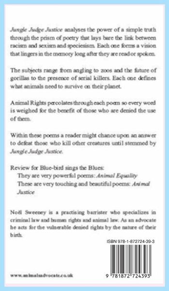 Jungle Judge Justice is a tough call as poetry books go as the poems cover contemporary issues and historical and likely future abuse with a gimlet eye. The poems consider aspects of our world as a prison for animals much as it has been for many vulnerable people throughout our history such as women burned at the stake as witches along with their black cats. In that prison the poems do not shy away from tackling matters within our vision yet often avoided including badger culling, eating animals, fox hunting, ritual slaughter, slavery and vivisection. A somewhat unusual type of cattle-market, which might take some readers off-guard, is considered: it is a little known quasi-legal practice of men selling their unwanted property to the highest bidder. The 'cattle-market' practice was adopted by men to dispose of their unwanted goods: 'Bullying drunkard philandering husbands/Whose vainglory keeps their ego trip alive...': What Am I Bid. Jungle Judge Justice challenges ¿all aspects of animal rights from their perceptive perspective. ¿¿¿The analysis of the subjects is not for those faint of heart and mind. The poetry ranges from the A to Z of all aspects of animal abuse and every subject between in the vast abacus of our abuse. Each one is intended to be a fading shooting star still faintly visible to each naked soul. The poetry explores in story and verse a running river of anthropology to zoology including from abattoirs to zoos and why our environment is dying whilst our seas have the Blues. ¿¿¿There is the odd tinge of humour here and there throughout the text especially with 'Paulo the Pussyfooter' which is a tribute to my magnificent favourite feline forever friend whose nocturnal activities caused so much nightly concerned joy and unexpected gifts. Paulo spread such an innocent mixed message that exuded natural happiness for all who knew her, it was enough to want to petition for her penchant to be a real life cat-burglar to become strictly legal. ¿¿The roots and routes of racism and sexism and speciesism are considered from many angles in relation to justice and truth. Given the tyranny over people in our modern world, we are driven to face the 'Time-bomb Heart' of deluded humans towards all animals. The idea captivated within that poem of the killing hills by us over the animal kingdom leads to a Putinesque belief we can do whatever we wish whenever we wish to whosoever we wish: 'It's a beautiful day. Let's go out and murder truth.' All that Jungle Judge Justice asks of any reader is that they approach the poems with an open mind and a heart to match. No poem will forgive the faint-hearted yet might touch one who looks into the eyes of another animal and sees their own reflection. Each will be enough to exceed any reach into a dormant soul. Each will allow the reader to peer past our prejudicial prism to see the sophism yet grasp the pain of the echoed roar and rasp of speciesism.