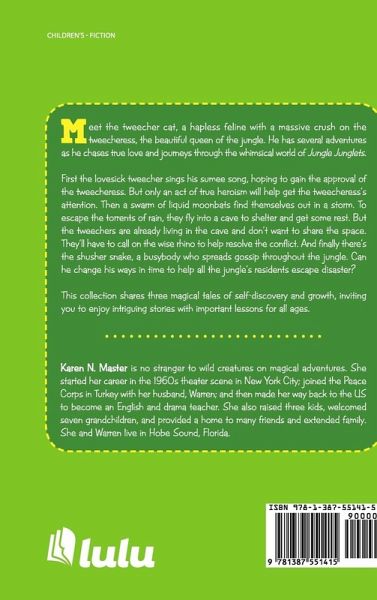 Meet the tweecher cat, a hapless feline with a massive crush on the tweecheress, the beautiful queen of the jungle. He has several adventures as he chases true love and journeys through the whimsical world of Jungle Junglets. First the lovesick tweecher sings his sumee song, hoping to gain the approval of the tweecheress. But only an act of true heroism will help get the tweecheress's attention. Then a swarm of liquid moonbats find themselves out in a storm. To escape the torrents of rain, they fly into a cave to shelter and get some rest. But the tweechers are already living in the cave and don't want to share the space. They'll have to call on the wise rhino to be the judge of the case. And finally there's the shusher snake, a busybody who spreads gossip throughout the jungle. Can he change his ways in time to help all the jungle's residents escape disaster? This collection shares three magical tales of self-discovery and growth, inviting you to enjoy intriguing stories with important lessons at their cores.