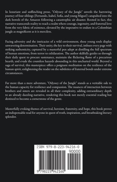 In luxuriant and unflinching prose, "Odyssey of the Jungle" unveils the harrowing journey of four siblings (Fernando, Isabel, Sofia, and young Miguel) catapulted into the dark bowels of the Amazon following a catastrophic air disaster. Rooted in fact, this narrative transcends reality to reach a realm where courage, ingenuity, and fraternal love form the very fabric of existence, elevated by the imperative to endure in a Colombian jungle as magnificent as it is merciless. Facing adversity and the intricacies of a wild environment, these young souls display unwavering determination. Their unity, the key to their survival, imbues every page with striking authenticity, captured by a masterful pen adept at distilling the full spectrum of human emotions, from terror to exhilaration. The author skilfully guides us through their daily quest to procure sustenance, maintain the flickering flame of a precarious hearth, and evade the countless hazards abounding in this uncharted world. Beyond a saga of survival, this masterpiece offers a poignant meditation on the resilience of the human spirit, enlightening the reader on the subtleties of fraternal bonds under extreme circumstances. Far more than a mere adventure, "Odyssey of the Jungle" stands as a veritable ode to the human capacity for resilience and compassion. The nuances of interaction between brothers and sisters are revealed in all their complexity, adding extraordinary depth to an already dazzling narrative, rendering this book not merely essential reading but destined to become a cornerstone of the genre. Masterfully evoking themes of survival, heroism, fraternity, and hope, this book proves an indispensable read for anyone in quest of truth, inspiration, and breathtaking literary splendor.