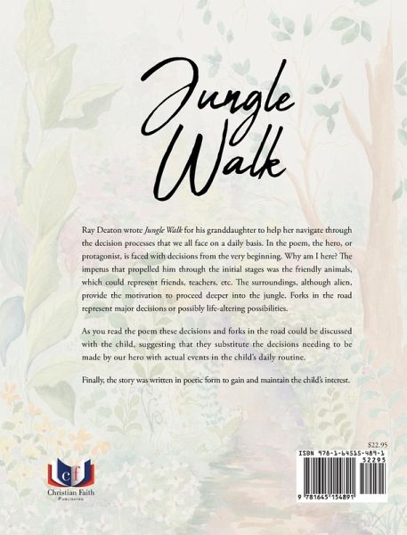 Ray Deaton wrote Jungle Walk for his granddaughter to help her navigate through the decision processes that we all face on a daily basis. In the poem, the hero, or protagonist, is faced with decisions from the very beginning. Why am I here? The impetus that propelled him through the initial stages was the friendly animals, which could represent friends, teachers, etc. The surroundings, although alien, provide the motivation to proceed deeper into the jungle. Forks in the road represent major decisions or possibly life-altering possibilities. As you read the poem these decisions and forks in…mehr