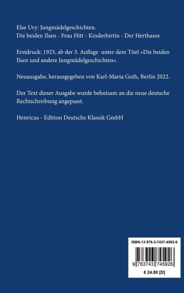 Else Ury: Jungmädelgeschichten. Die beiden Ilsen - Frau Hitt - Kinderhirtin - Der HerthaseeErstdruck: 1923, ab der 3. Auflage unter dem Titel »Die beiden Ilsen und andere Jungmädelgeschichten«.Neuausgabe, herausgegeben von Karl-Maria Guth, Berlin 2023.Der Text dieser Ausgabe wurde behutsam an die neue deutsche Rechtschreibung angepasst.Umschlagabbildung: Theo van Rysselberghe, Porträt von Helene und Michette Guinotte, 1901Gesetzt aus der Minion Pro, 11 pt.Die Sammlung Hofenberg erscheint im Verlag Henricus - Edition Deutsche Klassik GmbH, Berlin