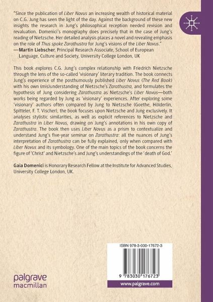 This book explores C.G. Jung's complex relationship with Friedrich Nietzsche through the lens of the so-called 'visionary' literary tradition. The book connects Jung's experience of the posthumously published Liber Novus (The Red Book) with his own (mis)understanding of Nietzsche's Zarathustra, and formulates the hypothesis of Jung considering Zarathustra as Nietzsche's Liber Novus -- both works being regarded by Jung as 'visionary' experiences. After exploring some 'visionary' authors often compared by Jung to Nietzsche (Goethe, Hölderlin, Spitteler, F. T. Vischer), the book focuses upon Nietzsche and Jung exclusively. It analyses stylistic similarities, as well as explicit references to Nietzsche and Zarathustra in Liber Novus, drawing on Jung's annotations in his own copy of Zarathustra. The book then uses Liber Novus as a prism to contextualize and understand Jung's five-year seminar on Zarathustra: allthe nuances of Jung's interpretation of Zarathustra can be fully explained, only when compared with Liber Novus and its symbology. One of the main topics of the book concerns the figure of 'Christ' and Nietzsche's and Jung's understandings of the 'death of God.'