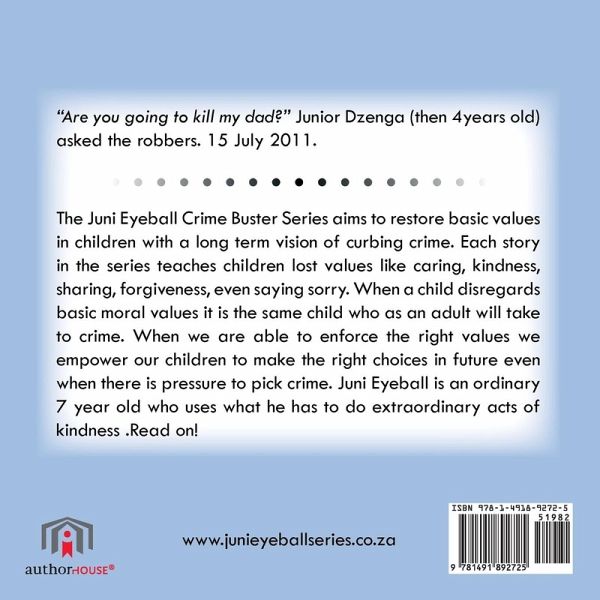 "Are you going to kill my dad?" Junior Dzenga then 4 years asked the robbers during an armed robbery. The Juni Eyeball Crime Buster Series aims to restore basic values in children with a long term vision of curbing crime. Each story in the series teaches children lost values like caring, kindness, sharing, forgiveness, even saying sorry. When a child disregards basic moral values it is the same child who as an adult will take to crime. When we are able to enforce the right values we empower our children to make the right choices in future even when there is pressure to pick crime. Juni Eyeball is an ordinary 7 year old who uses what he has to do extraordinary acts of kindness .Read on!