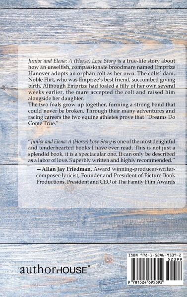 Junior and Elena is a (horse) love story. It is a true-life story about how an unselfish, compassionate broodmare named Emprize Hanover adopts an orphan colt as her own. The colt's dam, Noble Flirt, who was Emprize's best friend, succumbed to giving birth. Although Emprize had foaled a filly of her own several weeks earlier, the mare took the colt and raised him alongside her daughter. The two foals grew up together, forming a strong bond that could never be broken. Through their many adventures and racing careers, the two equine athletes proved that dreams do come true.