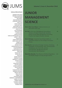 Sammelband aus dem Jahr 2018 im Fachbereich BWL - Allgemeines, , Sprache: Deutsch, Abstract: Junior Management Science (JUMS) ist das erste wissenschaftliche Journal, das die besten Abschlussarbeiten der Betriebswirtschaftslehre aus Deutschland, Österreich und der Schweiz (DACH-Region) veröffentlicht.Für die Publikationen von JUMS legen wir höchste wissenschaftliche Qualitätskriterien an. Um diese sicherzustellen, unterliegen die Abschlussarbeiten - wie in der Wissenschaft üblich - einem double-blind Review-Prozess. Dies bedeutet, dass zwei Wissenschaftlerinnen die Abschlussarbeiten unabhängig voneinander begutachten, ohne zu wissen, von wem und an welcher Hochschule die Arbeit verfasst worden ist. Nur die Arbeiten, welche einstimmig als herausragend beurteilt werden, werden von uns publiziert. Die Qualität der Begutachtung wird nicht zuletzt durch unser Advisory Editorial Board gewährleistet, welches über 50 Professorinnen von mehr als 30 Universitäten und Hochschulen aus der DACH-Region umfasst.In diesem Sammelband befindet sich eine Auswahl der besten Beiträge im Jahr 2018, welche in Junior Management Science Volume 3 Issue 4 publiziert wurden. Folgende Beiträge sind in diesem Sammelband enthalten:Cryptocurrencies as an Alternative Asset Class von Marius Max Lucas MayerIs the Use of Management Accounting in Startups a Paradox? A Systematic Literature Review of how Static Management Accounting Practices Can Support Dynamic Startups von Nico BollCorporate Social Responsibility: A Qualitative Analysis on the Strategy Formulation Process von Marie WehingerInternational Strategic Emphasis, Marketing Capabilities und Shareholder Value: Die finanziellen Implikationen des Trade-offs zwischen internationaler Wertgenerierung und internationaler Wertschöpfung von Nico SeverittThe Influence of Political Regulations and Market Design on Energy Storage Systems von Maximilian Blaschke