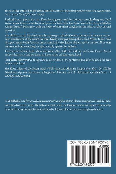 From an idea inspired by the classic Paul McCartney song comes Junior's Farm, the second entry in the series Tales Of Sardis County! Laid off from a job in the city, Katie Montgomery and her thirteen-year-old daughter, Carol Grace, move home to Sardis County...to the farm that had been owned by her grandfather, Arthur "Junior" Ballantine, with the hopes of raising her daughter in the relative safety of rural America. Alan Blake is a cop. He also leaves the city to go to Sardis County...but not for the same reason. Alan arrested one of the Giambini crime family's star gamblers: poker expert Moses Turley. Alan also grew up in Sardis County, but no one in the city knows that except his partner. Alan must hide out and stay alive long enough to testify against the mobster. Katie lets her former high school classmate, Alan, hide out with her and Carol Grace. But, in order to lie low on Junior's Farm, he has to work as Katie's farm hand. Then Katie discovers two things: She's a descendant of the Sardis family, and she's head over heels in love with Alan! Has Katie inherited the Sardis magic? Will Katie and Alan live happily ever after? Or will the Giambinis wipe out any chance of happiness? Find out in T. M. Bilderback's Junior's Farm - A Tale Of Sardis County!