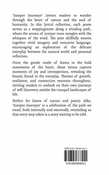 "Juniper Journeys" invites readers to wander through the heart of nature and the soul of humanity. In this lyrical collection, each poem serves as a steppingstone along a winding path, where the aroma of juniper trees mingles with the whispers of the wind. The poet skillfully weaves together vivid imagery and evocative language, encouraging an exploration of the delicate interplay between the natural world and personal reflection. From the gentle rustle of leaves to the bold statements of the heart, these verses capture moments of joy and introspection, revealing the beauty found in the everyday. Themes of growth, resilience, and connection resonate throughout, inviting readers to embark on their own journeys of self-discovery amidst the tranquil landscapes of life. Perfect for lovers of nature and poetry alike, "Juniper Journeys" is a celebration of the path we tread, both internally and externally, reminding us that every step taken is a story waiting to be told.