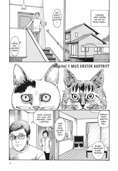 Gerade neu eingezogen, alles ist sauber, riecht frisch - da kommt per Post der Kratzbaum. J's Frau hatte kurz erwähnt, dass sie Yon von ihren Eltern holen wird... Und damit die etwas unheimliche Katze mit dem Totenkopffell nicht so allein ist, kommt Mu dazu. Der absolute Horror für den Horrormeister! Bis auch er dem Charme der beiden erliegt. Absurd komisch und herzerwärmend - Junji Ito als Katzenhalter!