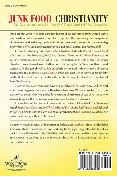 The past fifty years have seen a steady decline of biblical mores in the United States and much of Western culture. As if in response, the frequency and magnitude of disasters and suffering, both natural and manmade, seems to be exploding everywhere. What might this mean for you and me, America, and humankind? Author Jay Anthony has witnessed much of the decline firsthand. In Junk Food Christianity: The Decline of the USA, the End Times, and Biblical Prophecy, he surveys numerous and often subtle ways Americans, even within many Christian churches, have strayed ever further from following God's Word as their moral standard. As the god of feelings is increasingly celebrated and worshipped at many a pulpit and altar, Junk Food Christianity draws our attention to how God historically dealt with humankind-in particular with the chosen people, when they, too, strayed from God's Word. Discover how numerous gods have infiltrated our lives. Learn how God reacted when previous generations evicted him from their lives. What can we learn from the signs of our times? Our loving God forewarns us of an impending fate for those who choose to ignore the harbingers accompanying the decline of mores. Are we headed for the end times - of our nation, of the World? Is there any hope? Junk Food Christianity: The Decline of the US, the End Times, and Biblical Prophecy holds the key to a way out of our predicament and to saving ourselves, our nation, and perhaps life on this planet!