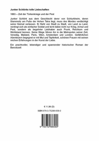 1663 Zeit der Türkenkriege und der PestJunker Schlörk aus dem Geschlecht derer von Schlurkheim, deren Stammsitz am Fuße der Hohen Tatra liegt, muss des Mordes verdächtigt seine Heimat verlassen. Er flieht von Stadt zu Stadt, von Land zu Land, verdingt sich als einfacher Soldat und lernt dabei nicht nur Krieg, Armut und Pest, sondern als begehrter Liebhaber auch Prunk, Reichtum und Wohlstand kennen. Seine Wege führen ihn in die Metropolen seiner Zeit, Venedig, Mailand, Paris, Wien, Amsterdam und London. Gefährlichen Abenteuern begegnet er mit Mut und Tapferkeit, schönen Frauen mit seinen reichen Erfahrungen in der Kunst der Liebe.Ein prachtvoller, lebendiger und spannender historischer Roman der Barockzeit.