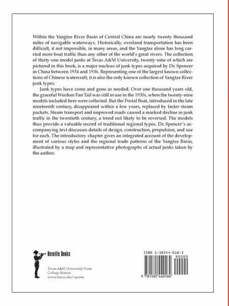 Within the Yangtze River Basin of Central China are nearly twenty thousand miles of navigable waterways. Historically, overland transportation has been difficult, if not impossible, in many areas, and the Yangtze alone has long carried more boat traffic than any other of the world's great rivers. The collection of thirty-one model junks at Texas A&M University, twenty-nine of which are pictured in this book, is a major nucleus of junk types acquired by Dr. Spencer in China between 1934 and 1936. Representing one of the largest known collections of Chinese watercraft, it is also the only known collection of Yangtze River junk types. Junk types have come and gone as needed. Over one thousand years old, the graceful Wushan Fan Tail was still in use in the 1930's, when the twenty-nine models included here were collected. But the Postal Boat, introduced in the late nineteenth century, disappeared within a few years, replaced by faster steam packets. Steam transport and improved roads have caused a marked decline in junk traffic in the twentieth century, a trend not likely to be reversed. The models thus provide a valuable record of traditional regional types. Dr. Spencer's accompanying text discusses details of design, construction, propulsion, and use for each. The introductory chapter gives an integrated account of the development of various styles and the regional trade patterns of the Yangtze Basin, illustrated by a map and representative photographs of actual junks taken by the author. The twenty-nine models featured here are a major nucleus of the Chinese freshwater junk types acquired by Dr. Spencer in China between 1934 and 1936, and they represent one of the largest known collections of its kind.