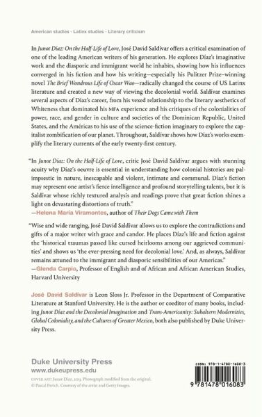 In Junot Díaz: On the Half-Life of Love, José David Saldívar offers a critical examination of one of the leading American writers of his generation. He explores Díaz's imaginative work and the diasporic and immigrant world he inhabits, showing how his influences converged in his fiction and how his writing-especially his Pulitzer Prize--winning novel The Brief Wondrous Life of Oscar Wao-radically changed the course of US Latinx literature and created a new way of viewing the decolonial world. Saldívar examines several aspects of Díaz's career, from his vexed relationship to the literary aesthetics of Whiteness that dominated his MFA experience and his critiques of the colonialities of power, race, and gender in culture and societies of the Dominican Republic, United States, and the Américas to his use of the science-fiction imaginary to explore the capitalist zombification of our planet. Throughout, Saldívar shows how Díaz's works exemplify the literary currents of the early twenty-first century.