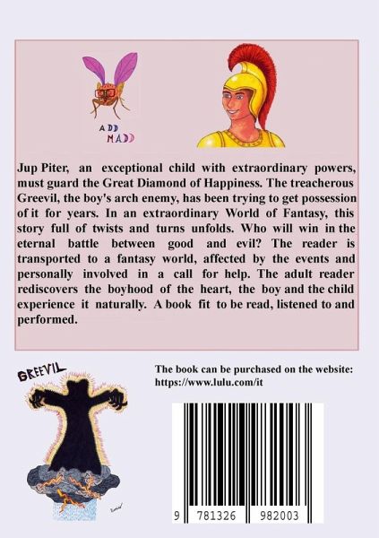 Jup Piter, an exceptional child with extraordinary powers, must guard the Great Diamond of Happiness. The treacherous Greevil, the boy's arch enemy, has been trying to get possession of it for years. In an extraordinary World of Fantasy, this story full of twists and turns unfolds. Who will win in the eternal battle between good and evil? The reader is transported to a fantasy world, affected by the events and personally involved in a call for help. The adult reader rediscovers the boyhood of the heart, the boy and the child experience it naturally. A book fit to be read, listened to and performed.