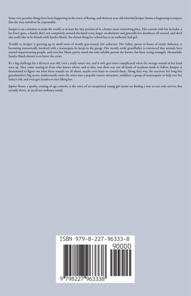 Some very peculiar things have been happening in the town of Boring, and thirteen-year-old whiz kid Juniper Smote is beginning to suspect that she may somehow be responsible. Juniper is on a mission to make the world, or at least her tiny portion of it, a better, more interesting place. Her current wish list includes: a lot fewer guns, a family that's not completely around-the-bend crazy, larger vocabularies and generally less dumbness all around, and she'd also really like to be friends with Sandra Shuck, the closest thing her school has to an authentic bad girl. Trouble is, Juniper is growing up in small town of mostly gun-crazed, low achievers. Her father, prone to bouts of erratic behavior, is becoming romantically involved with a mannequin he keeps in the garage. Her mostly senile grandfather is convinced that animals have started impersonating people, and even her Mom, pretty much the only reliable person she knows, has been acting strangely. Meanwhile, Sandra Shuck doesn't even know she exists. It's a big challenge for a thirteen year old, even a really smart one, and it only gets more complicated when the strange sounds in her head start up. They come roaring in from who knows where, and as they roar their way out all kinds of mayhem tends to follow. Juniper is determined to figure out what these sounds are all about, maybe even learn to control them. Along they way, she uncovers her long lost grandmother's big secret, inadvertently turns the town into a popular tourist attraction, mobilizes a group of mannequins to help save her father's job, and even gets Sandra to start liking her. Jupiter Roars, a quirky, coming of age comedy, is the story of an exceptional young girl intent on finding a way to not only survive, but actually thrive, in an all too ordinary world.