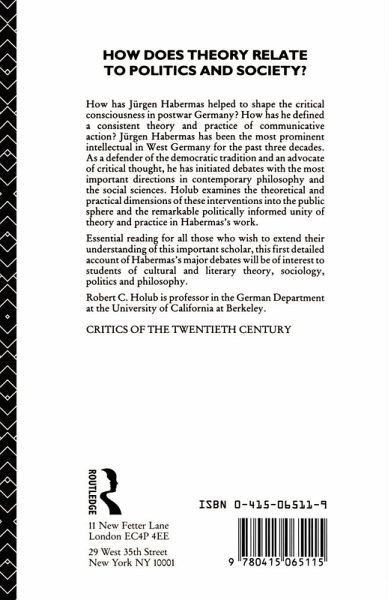 The most important intellectual in the Federal Republic of Germany for the past three decades, Habermas has been a seminal contributor to fields ranging from sociology and political science to philosophy and cultural studies. Although he has stood at the centre of concern in his native land, he has been less readily accepted outside Germany, particularly in the humanities. His theoretical work postulates the centrality of communication and understanding, and as such his strategy of debate is marked by a politically informed unity of theory and practice. Holub's book is the first detailed account of the major debates in which Habermas has engaged since the early sixties. It stems from the conviction that his critics have not understood the political strategy behind his various interventions, or the consistency that informs his intellectual activities. Habermas is viewed in dialogue with important philosophical, sociological and political currents in West Germany. Holub demonstrates how Habermas pursues a course that incorporates various aspects of his opponents' positions, while simultaneously defending perceived threats to democracy and open discussion.
