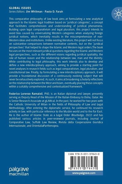 This comparative philosophy of law book aims at formulating a new analytical approach to the Islamic legal tradition based on 'juridical categories', a concept that facilitates comprehension and understanding of juridical phenomena. Building upon legal comparativism and legal pluralism, this project intends to avoid bias caused by universalizing Western categories when analyzing foreign juridical notions, which inevitably results in the miscomprehension of non-Western ideas and institutions. Unlike existing literature, this project will not focus on substantive comparisons between normative contents, but on the 'juridical perspectives' that helped to shape the Islamic and Western legal orders.The book focuses on the most relevant juridical questions regarding the Islamic and Western legal perspectives, such as the different visions regarding juridical spatiality, the role of human reason and the relationship between law, man and the divinity. While contributing to legal philosophy, this work intends also to develop and define a new interdisciplinary approach, aiming to provide a starting point for novel analyses in research fields such as legal comparativism, legal pluralism, and constitutional law. Finally, by formulating a new interdisciplinary approach, it will provide a foundational discussion of a continuously evolving subject that will never be exhaustively explored. As such, it aims at broadening scholarly reflections on the relationship between the West and Islam, eventually placing these concepts within a suitably comprehensive and contextualized framework.