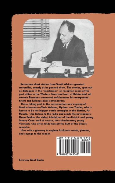 Seventeen short stories from South Africa's greatest storyteller, exactly as he penned them. The stories, spun out as dialogues in the "voorkamer" or reception room of the post office in the Western Transvaal town of Bekkersdal, all contain Bosman's renowned soft humour, his unexpected twists and lurking social commentary. Those taking part in the conversations are a group of Marico farmers-Chris Welman, Gysbert van Tonder, who is known to be the biggest cattle smuggler in the district, At Naudé, who listens to the radio and reads the newspapers, Oupa Bekker, the oldest inhabitant of the district, and young Johnny Coen. And of course, the schoolmaster, young Vermaak, who often finds himself the butt of the others' remarks. In the course of these conversations, as points of view are expanded and elucidated, these people are brought with all the foibles and idiosyncrasies. Now with a glossary to explain Afrikaans words, phrases, and sayings to the present-day reader.