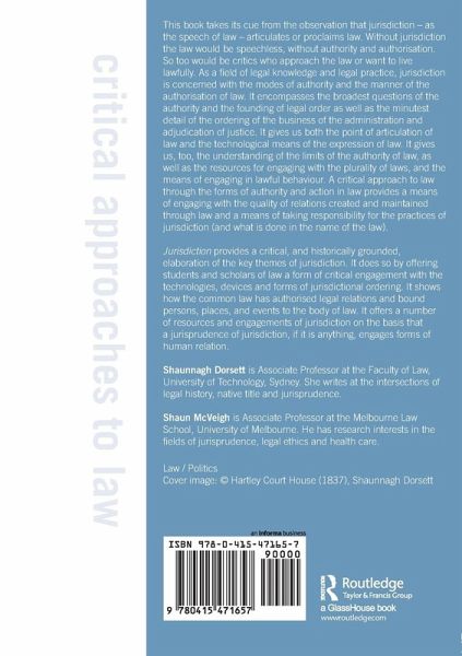 This book takes its cue from the observation that jurisdiction - as the speech of law - articulates or proclaims law. Without jurisdiction the law would be speechless, without authority and authorisation. So too would be critics who approach the law or want to live lawfully. As a field of legal knowledge and legal practice, jurisdiction is concerned with the modes of authority and the manner of the authorisation of law. It encompasses the broadest questions of the authority and the founding of legal order as well as the minutest detail of the ordering of the business of the administration and adjudication of justice. It gives us both the point of articulation of law and the technological means of the expression of law. It gives us too, the understanding of the limits of the authority of law, as well as the resources for engaging with the plurality of laws, and the means of engaging in lawful behaviour. A critical approach to law through the forms of authority and action in law provides a means of engaging with the quality of relations created and maintained through law and a means of taking responsibility for the practices of jurisdiction (and what is done in the name of the law). ¿ This book provides a critical, and historically grounded, elaboration of the key themes of jurisdiction. ¿It does so by offering students and scholars of law a form of critical engagement with the technologies, devices and forms of jurisdictional ordering. It shows how the common has authorised legal relations and bound persons, places, and events to the body of law. It offers a number of resources and engagements of jurisdiction on the basis that a jurisprudence of jurisdiction, if it is anything, engages forms of human relation. ¿ ¿